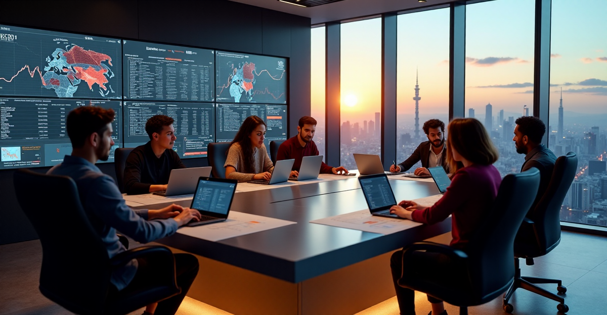 "Diverse entrepreneurs from around the world collaborate on cryptocurrency trading at a modern office space with city views."